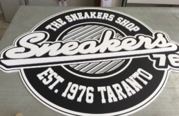 Sneakers 76, insegne 3d, insegne in legno, insegne legno3d, tagliocnc, incisione e taglio laser pugliasistemi.com, designlab, pubblicità taranto