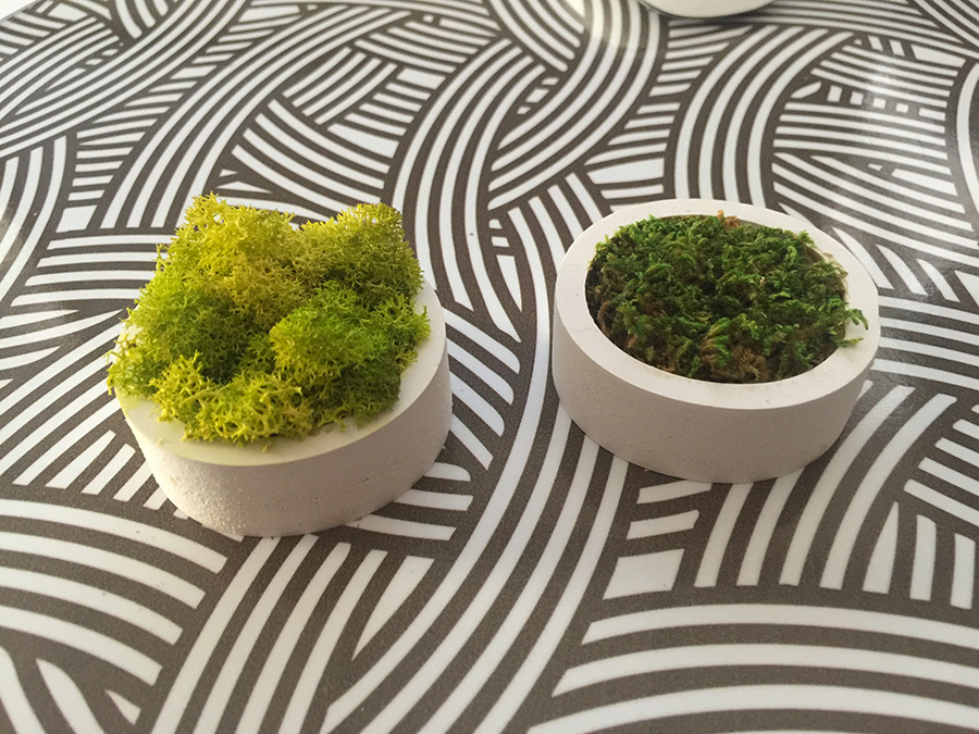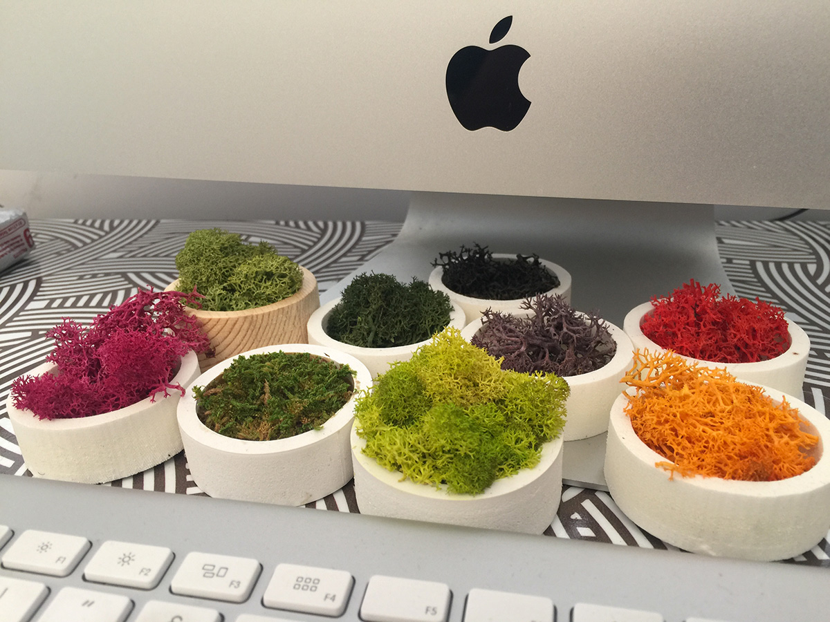 plastico all’interno dei quali assembliamo manualmente singoli fogliami, muschi e licheni stabilizzati disponibili in tantissimi colori.